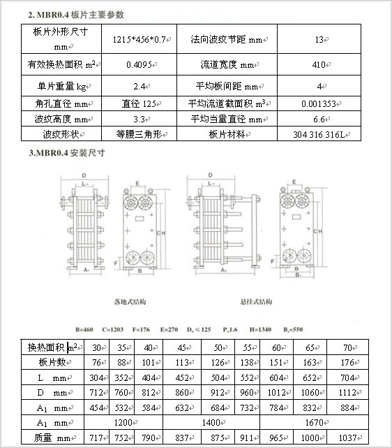 | MBR0.4型板式換熱器產(chǎn)品簡介:我廠生產(chǎn)的MBR0.4型板式換熱器,具有換熱效率高,物料流阻損失小,結(jié)構(gòu)緊湊,溫度控制靈敏,操作彈性大,裝拆清洗方便,使用壽命長等特點,是目前國內(nèi)最先進的高效換熱器。 我廠生產(chǎn)的MBR0.4型板式換熱器產(chǎn)品,可處理的物料非常廣泛,從普通的工業(yè)用水,到高粘度的液體,從衛(wèi)生要求較高的食品液體、醫(yī)藥物料到具有一定腐蝕性的酸堿液體,從含小顆粒粉體液體物料到含少量纖維的懸浮液體均可采用板式換熱器處理。 MBR0.4型板式換熱器應(yīng)用廣泛,可用于加熱、冷卻、蒸發(fā)、冷凝、殺菌消毒、熱力回收等場合。如冷卻發(fā)電機組和整流器內(nèi)循環(huán)水;冶金礦山等機械潤滑油;液壓站、稀油站的液壓油;機械制造中的淬火油、電鍍?nèi)芤旱?;用于食品釀造行業(yè)中麥芽汁、蛋液、食用油的殺菌消毒,啤酒、葡萄酒的殺菌處理;用于輕紡工業(yè)、造紙行業(yè)中的余熱回收;收集冷凝水,集中供熱;汽改水暖;鍋爐除氧系統(tǒng)中的中間加熱等,板式換熱器都是最聯(lián)想的換熱設(shè)備。目前已廣泛用于冶金、礦山、石油、化工、電力、醫(yī)藥、食品、化纖、輕紡、造紙、船舶和集中供熱等工業(yè)部門。 MBR0.4型板式換熱器結(jié)構(gòu)原理: MBR0.4型板式換熱器訂貨須知: